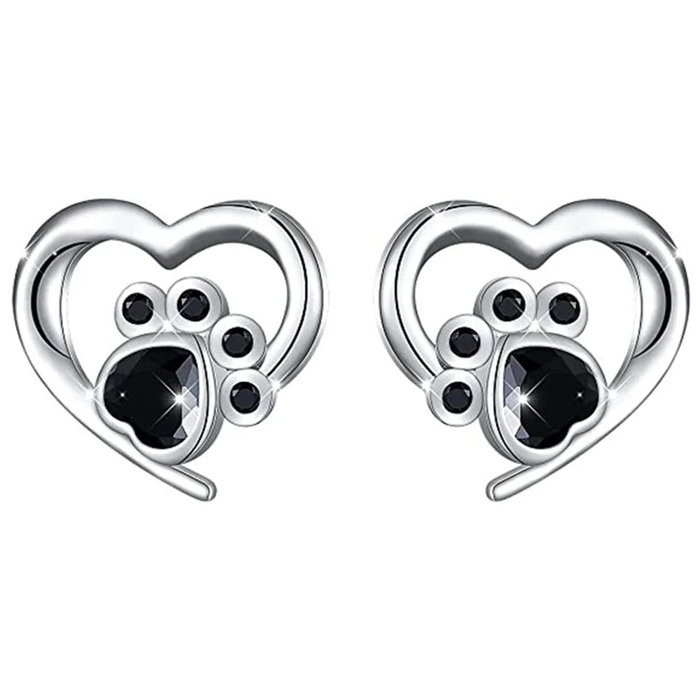 Hjärta- och tassörhängen – silverfärgade örhängen med svart kristall, förtrollande djurmotiv